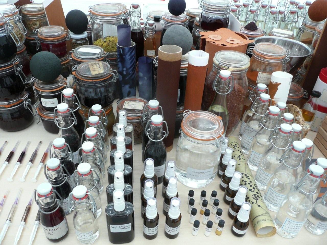 Zu den Künstler*innen, denen das und.Institut sich verbunden weiß, zählt namentlich George Steinmann, hier mit The World and the Mind, Mixed-Media-Installation, 2006. Quellsubstanzen, Wasser, Gesteine, Heilpflanzen, Pflanzensäfte. Tisch 125x380 cm, Ausschnitt. © George Steinmann