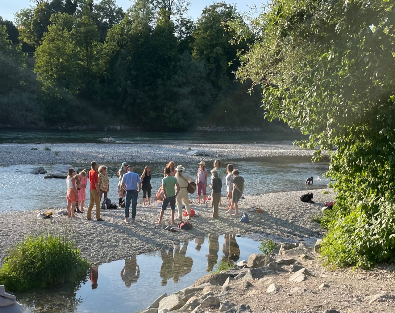 Wahrnehmend, spürend, klingend, schaffen wir ein singendes Flussbett beim FlussSingen am Lech, Juni 2023, Foto: SINGING PLANET