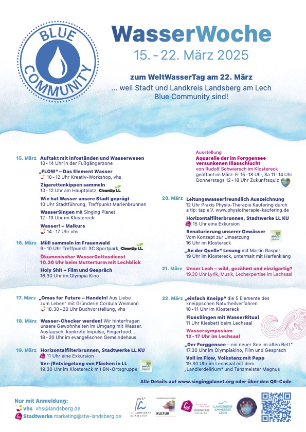Auf dem Weg zur www.blue-community-deutschland.com mit Stadt und Landkreis Landsberg am Lech, entstand seit 2023 ein umfangreiches Angebot, rund um das ÜberLebensThema: Was brauchst Du? – Wasser brauchst Du! Im Wassersymposium werden Handlungsimpulse ins Fließen gebracht, Das bereits 3. WasserSympsoium wird am 22.3.2025 stattfinden www.singingplanet.org/wassersymposium/ Für den Genuss von Leitungswasser wird bei der Wasserbar geworben, um Plastikmüll, CO2 und Geld zu sparen. Ganz nach dem Motto: "wir machen Leitungswasser salonfähig!". Es wird getanzt 'voll im Flow'... , Kooperationen mit der Volkshochschule, Bund Naturschutz, Kino und weiteren Initiativen, mögen die Menschen vor Ort verbinden, vernetzen, geradezu "durchtränken" mit WasserWohl und WasserWissen.
