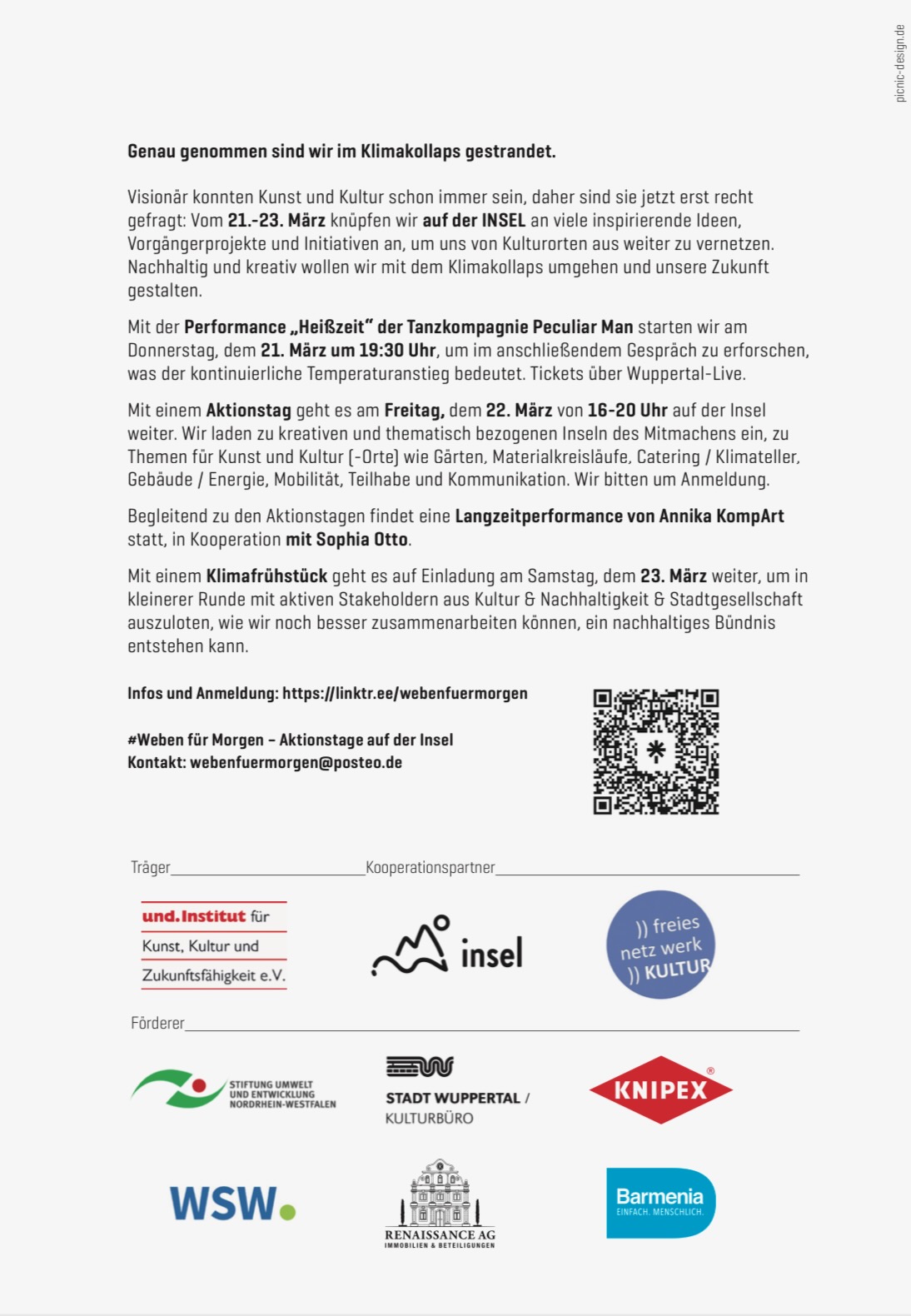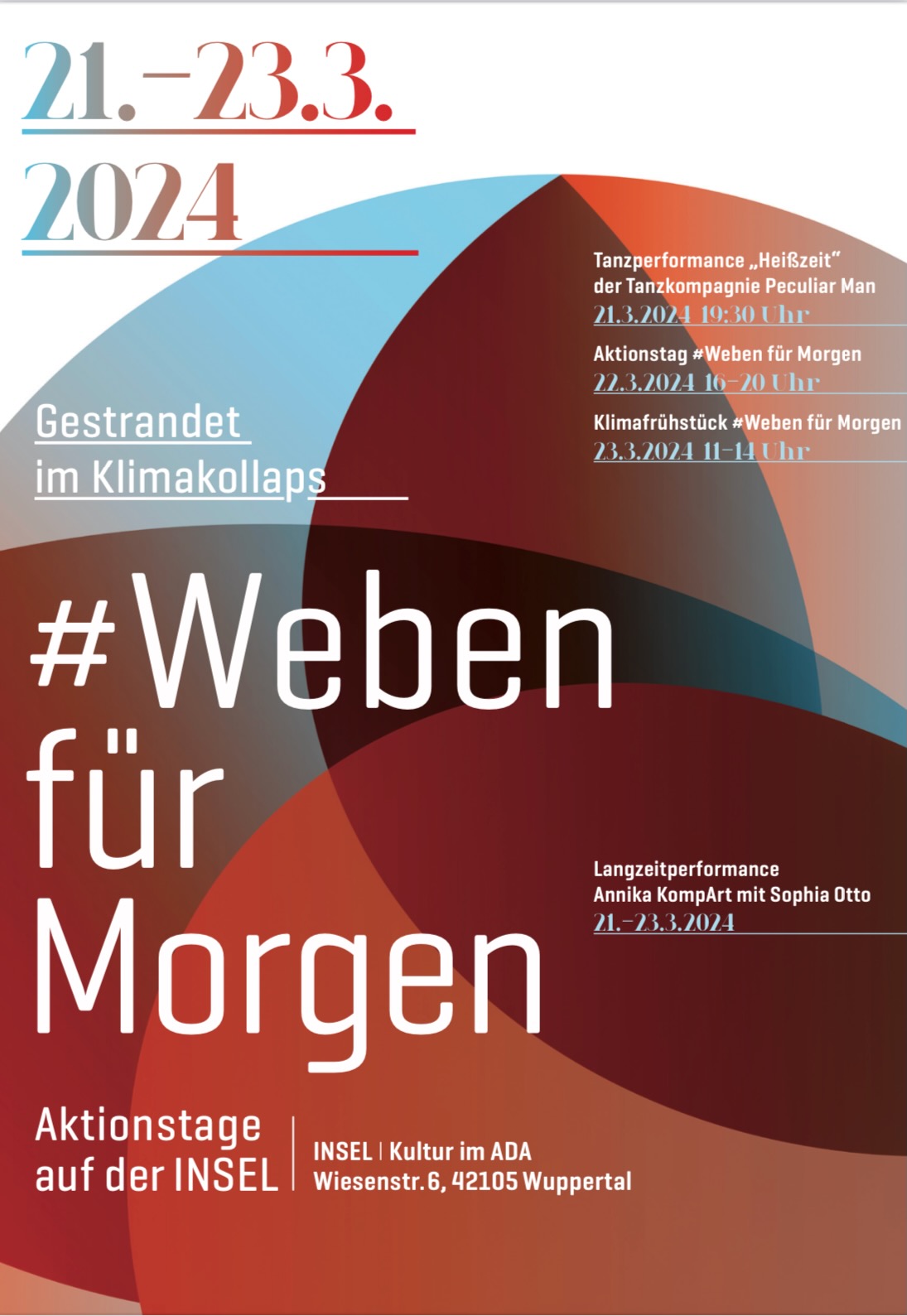 Mit »#Weben für Morgen« haben Aktionstage vom 21.-23. März 2024 auf der INSEL, einem Wuppertaler Kulturort weitere kreative und lebendige Fährten gelegt. Sie haben an viele inspirierende Ideen, Vorgängerprojekte und Initiativen angeknüpft, um gemeinsam auszuloten, wie die Kulturszene und Stadtgesellschaft nachhaltig und kreativ mit dem Klimakollaps umgehen und mit konkreten Ideen unsere Zukunft gestalten können.