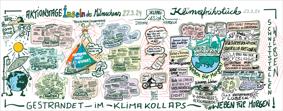 Beim Klimafrühstück am Samstag, dem 23. März 2024 kamen in kleinerer Runde aktive Stakeholder aus Kultur & Nachhaltigkeit & Stadtgesellschaft zusammen. Dabei waren der Oberbürgermeister Uwe Schneidewind, Christine Altmann für das Orchester des Wandels, der Geschäftsführer des Circular Valley Andreas Mucke, der Leiter des Unternehmens Neue Effizienz, die bildende Künstlerin Andrea Raak, die Nachhaltigkeitswissenschaftler am Wuppertal Institut Johannes Venjakob und Severin Hackspiel, die inhaltliche Koordinatorin des entstehenden Pina Bausch Zentrums Bettina Milz, der Utopist David J. Becher, der Leiter des soziokulturellem Zentrums die börse Lukas Hegemann, der Tänzer Felix Bürkle, und viele weitere Kunstschaffende und Aktive. Das Frühstück wurde vom Unverpacktladen Ohne Wenn und Aber ausgerichtet. Flaschenbotschaften, die auf den thematischen Inseln des Mitmachens zuvor entstanden waren, haben konkrete Impulse eingebracht, wie im Sinne eines Weiterwebens alle noch besser zusammenarbeiten können und ein nachhaltiges Bündnis entstehen kann. Die Botschaften und Statements der Aktionstage werden aktuell noch weiter ausgearbeitet.