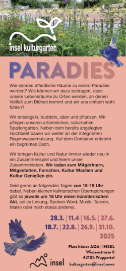 Auch hat der zentrale #Weben für Morgen-Akteur INSEL Kulturgarten 2025 am Wuppertaler Kulturort INSEL weiter zum Thema PARADIES gewirkt: Wie können öffentliche Räume zu einem Paradies werden? Wie können wir zu einem guten Leben beitragen, indem unsere Lebensräume zu Orten werden, an denen Vielfalt zum Blühen kommt und wir uns einfach wohl fühlen? Hier wird entsiegelt, gebuddeln, gesäet und gepflanzt. Wir pflegen unseren artenreichen, naturnahen Spaltengarten. Neben dem bereits angelegten Hochbeet haben wir weiter an der integrierten Regenwassernutzung gebaut. Auf dem Container sind alle Grundlage, die Struktur und Bepfllanzung für ein begrüntes Dach entstanden. Wir bringen Kultur und Natur immer wieder neu in ein Zusammenspiel und feiern einfach unser Zusammenleben. Auch im nächsten Jahr 2026 werden wir zum Mitgärtnern, Mitgestalten, Forschen, Kultur Machen und Kultur Genießen einladen, die Termine folgen noch. Neben kleinen kulinarischen Überraschungen gab es jeweils auch künstlerische Akt, sei es Lesung, Spoken Word, Musik, Tanzen, Malen oder noch etwas anderes.