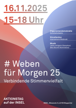 Mit einem Aktionstag #Weben für Morgen 25 - Verbindende Stimmenvielfalt am 16. November 2025 im Kulturort INSEL in Wuppertal haben wir weitergewoben für eine gute Zukunft – anknüpfend an »Gestrandet im Klimakollaps: #Weben für Morgen 24« und parallel zur Weltklimakonferenz COP30 in Belém/Brasilien.